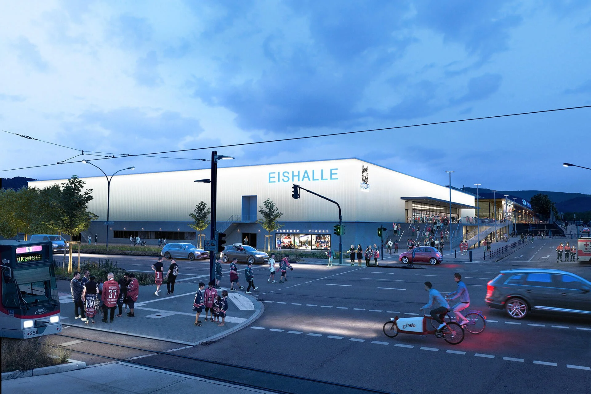 Für die Stadt Freiburg haben wir im Rahmen einer Konzeptstudie Visualisierungen für die geplante neue Eishalle am Standort Messe Freiburg erstellt. Dazu gehören eine Tages- und eine Abendperspektive der Außenansicht sowie zwei Innenvisualisierungen, die die räumliche Wirkung und Atmosphäre der zukünftigen Halle zeigen.