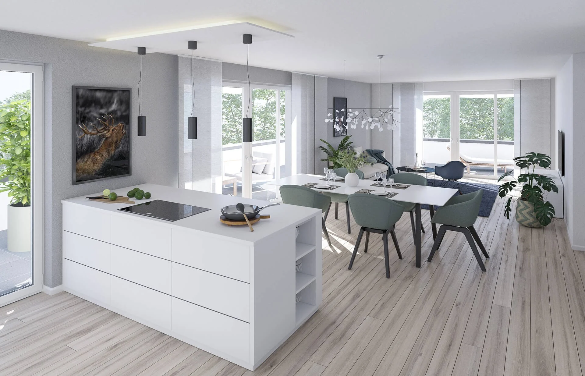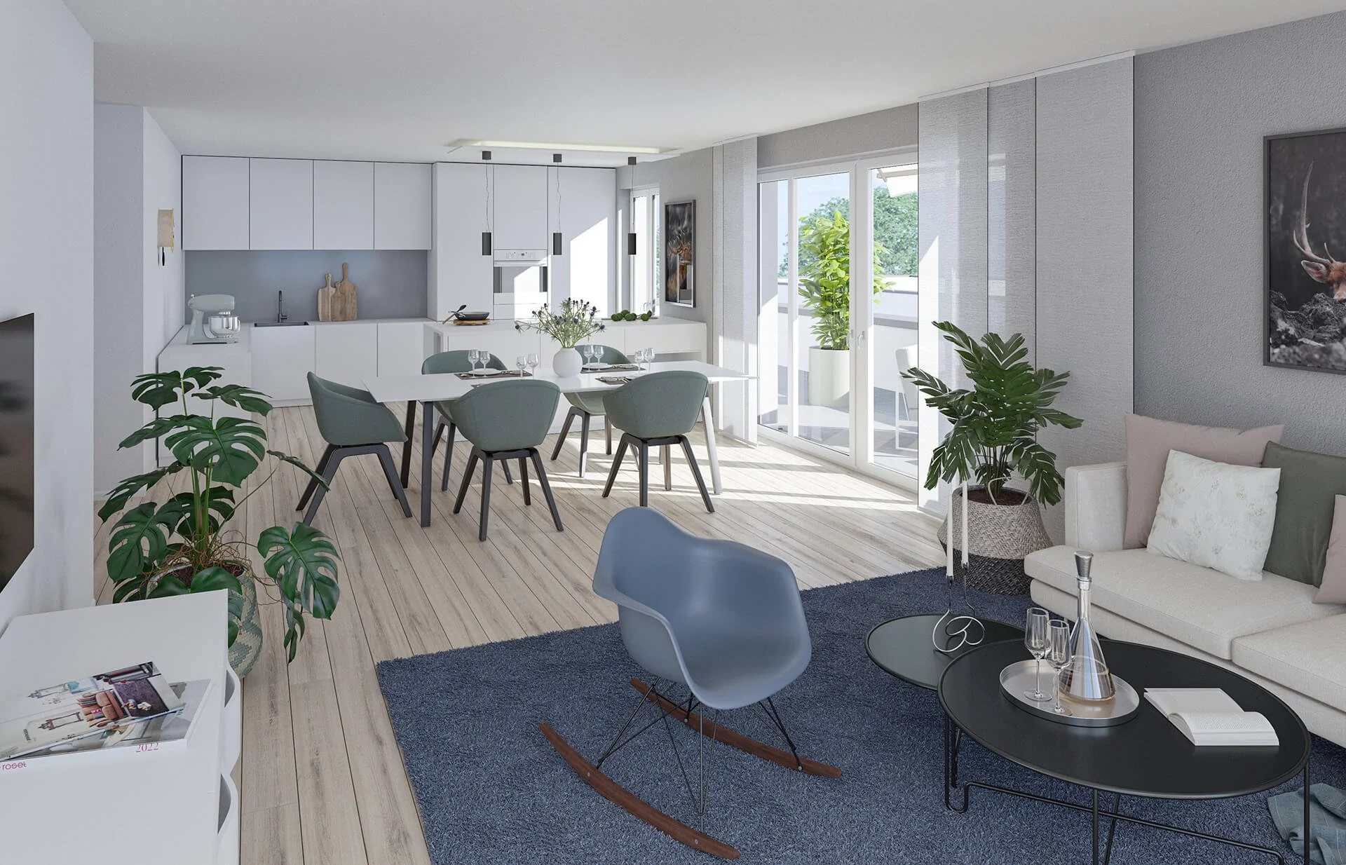 Die Kombination aus Innen- und Außenvisualisierungen sowie der Luftperspektive schafft einen ganzheitlichen Eindruck des Projekts und unterstützt die Vermarktung wirkungsvoll.