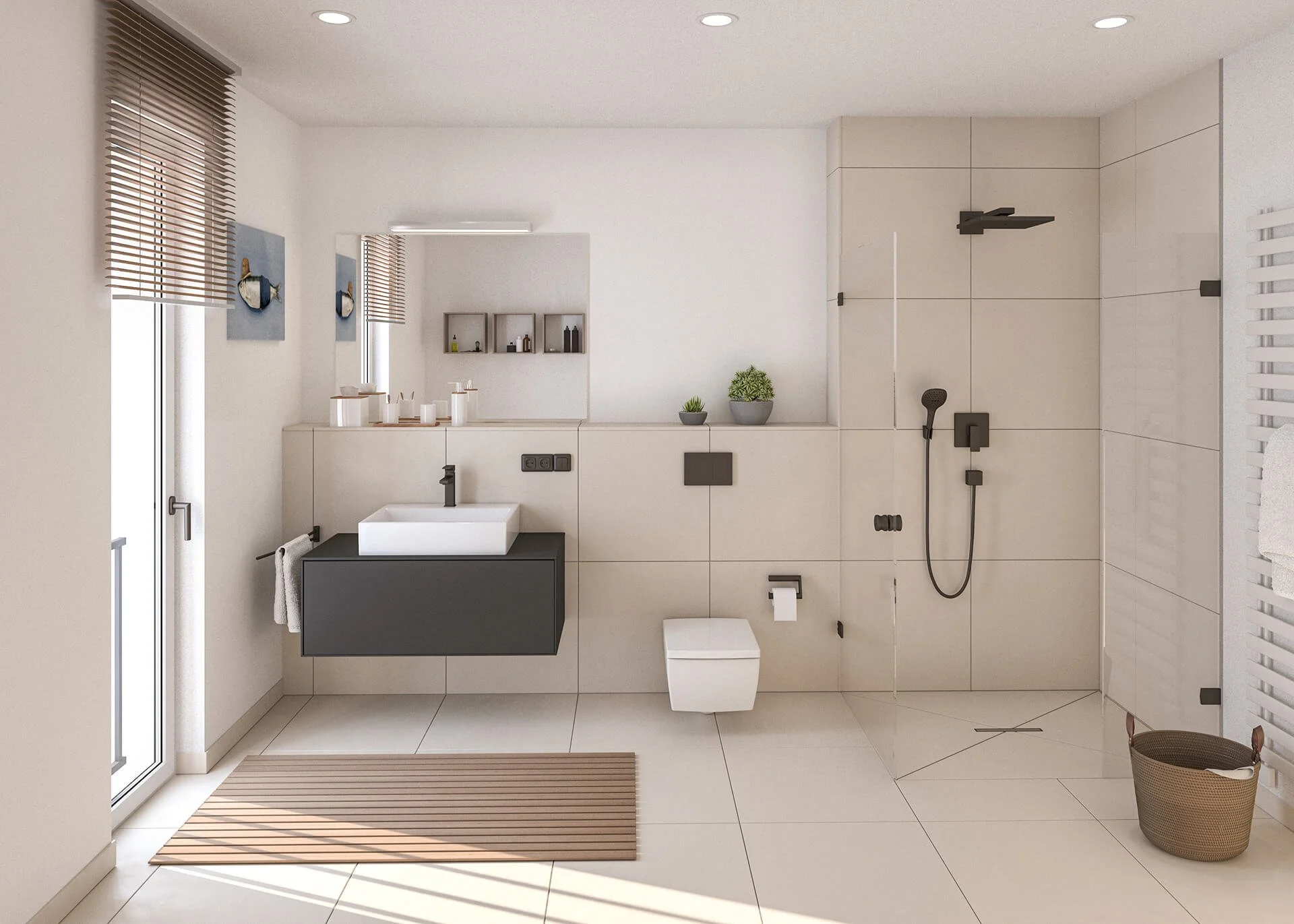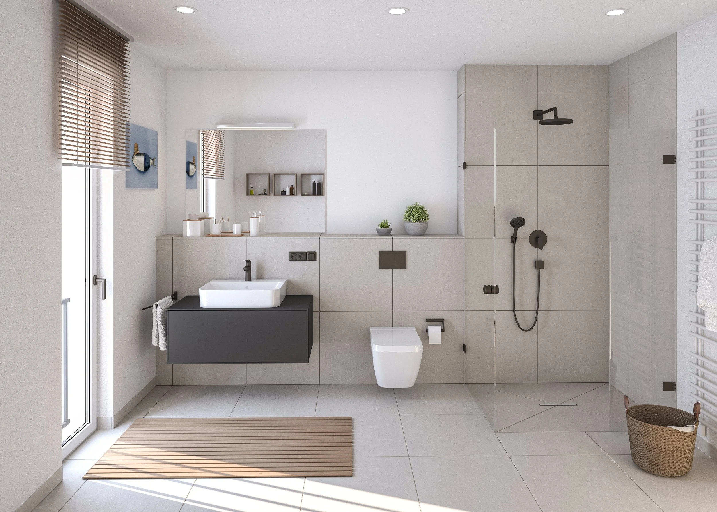 Neben atmosphärischen Außenperspektiven entstanden hochwertige Innenraumvisualisierungen, darunter Wohnbereiche, detaillierte Badansichten sowie weitere Raumdarstellungen. Ergänzend dazu erstellten wir eine Vogelperspektive, die das Projekt realistisch in die bestehende Umgebung einbettet. Grundlage hierfür waren integrierte Landschaftsaufnahmen aus Drohnenbildern, die eine präzise und authentische Darstellung der Lage ermöglichen.
