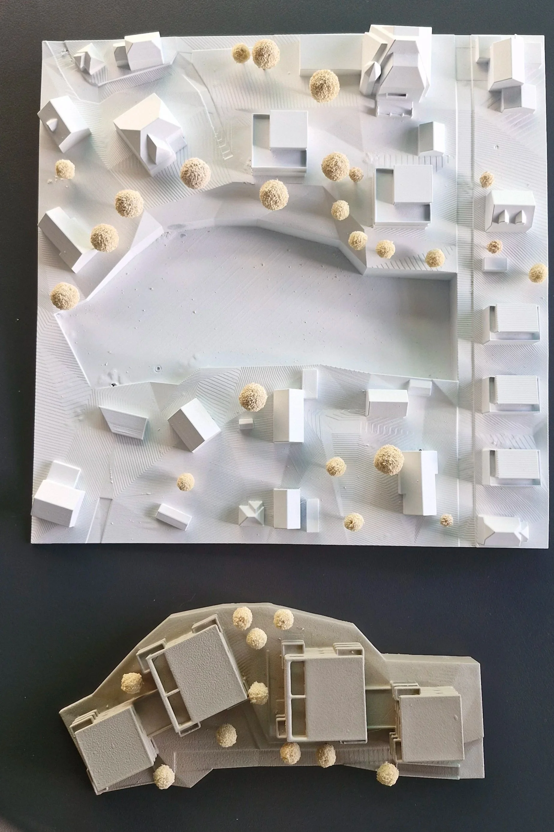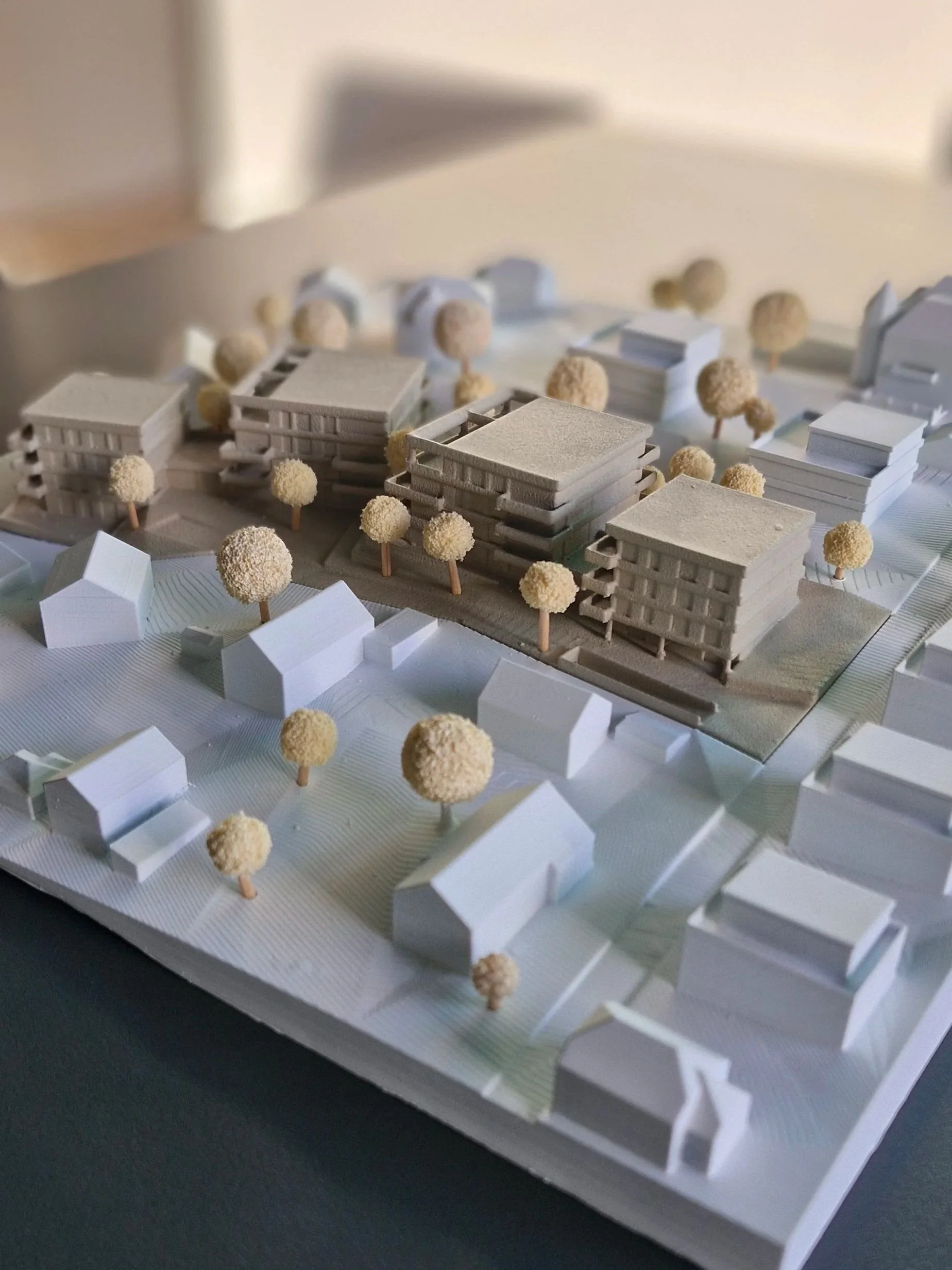 Dank der detaillierten 3D-Daten der Perspektive konnten wir das Modell direkt für den 3D-Druck nutzen. So entstand ein anschauliches und maßstabsgetreues (1:500) Modell, das das architektonische Konzept der vier Punkthäuser mit insgesamt 40 Wohneinheiten in Hanglage optimal darstellt. Die klare Setzung der Baukörper und die Einbindung in das Gelände werden durch das gedruckte Modell besonders deutlich.