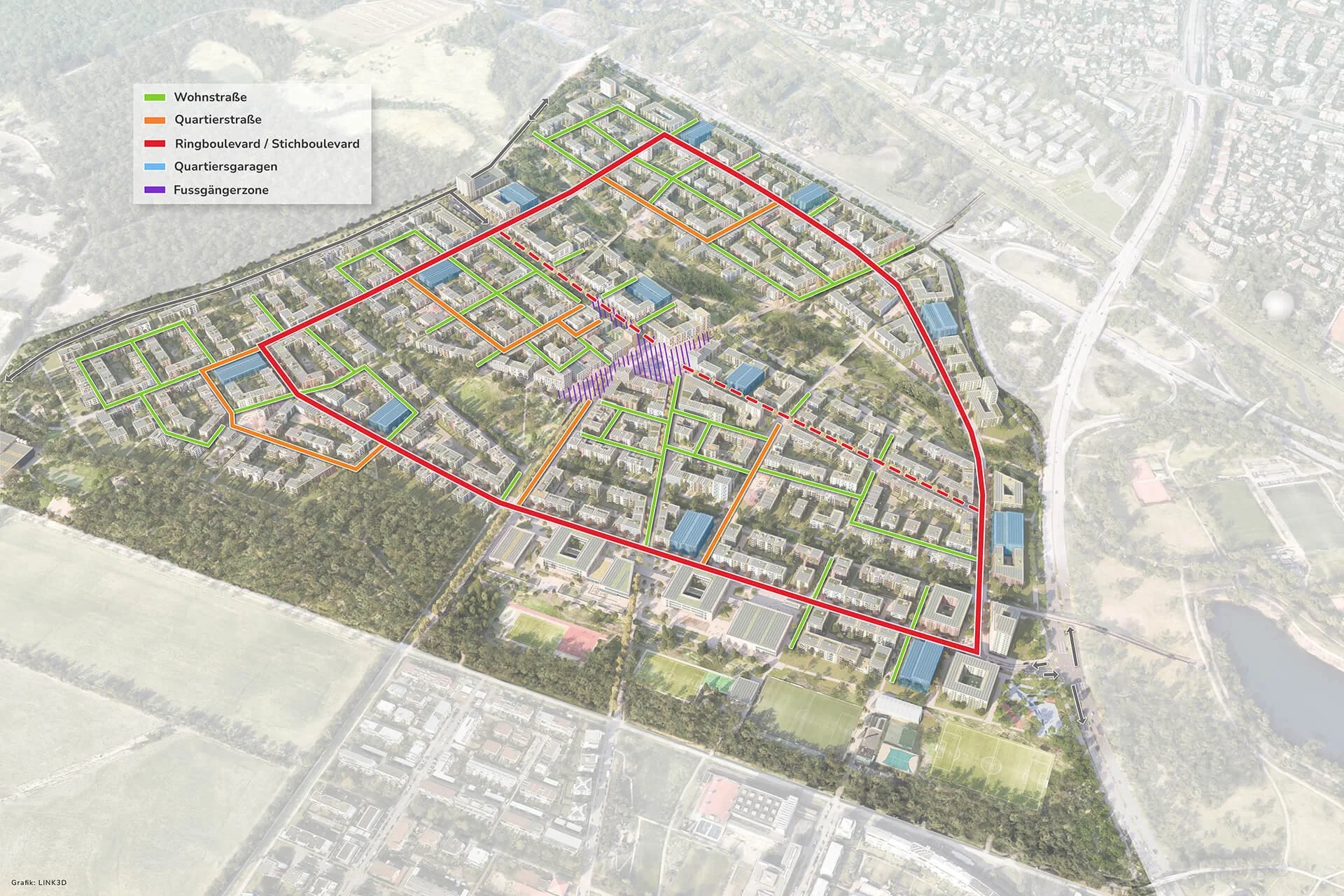 Ein besonderer Fokus liegt auf der Förderung klimafreundlicher Mobilität, um eine nachhaltige und umweltbewusste Verkehrsweise im neuen Quartier zu erleichtern.