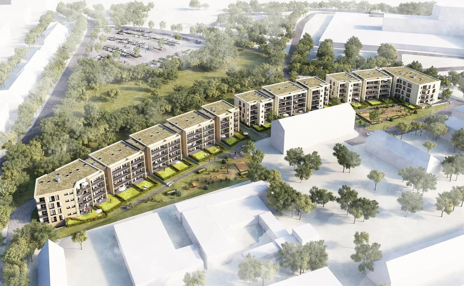 Die Darstellung aus dem Jahr 2018 zeigt die geplante Wohnbebauung und vermittelt einen realitätsnahen Eindruck der architektonischen Gestaltung sowie der Einbindung in das Umfeld.